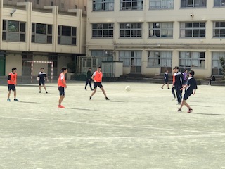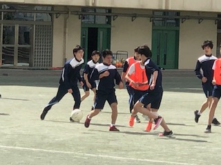 3年生の保健体育の授業では、サッカーをやっていました。授業の後半は試合練習なので、生徒たちは必死にボールを追い、ゲームを楽しんでいました。