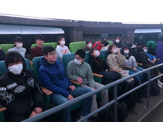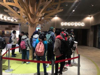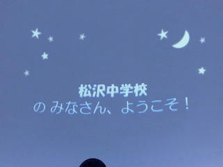 プラネタリウムに入りました。空に「松沢中学校のみなさん ようこそ」という文字が浮かび上がりました。