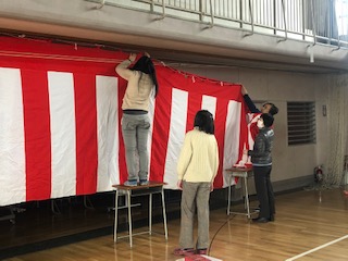 紅白幕をつけていきます。シワが出ないようにピンと貼るのがなかなか難しいですね。