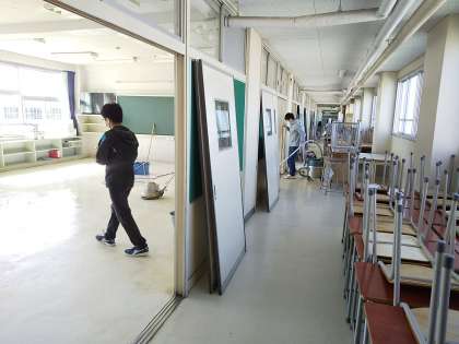下に出して教室の床を磨いています。学校が再開した時に、気持ちよく学校生活を迎え