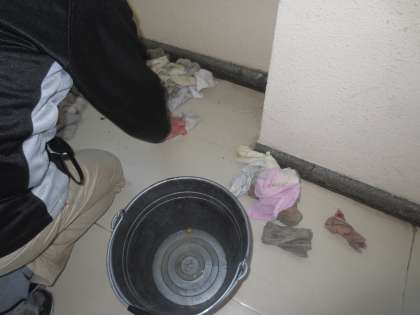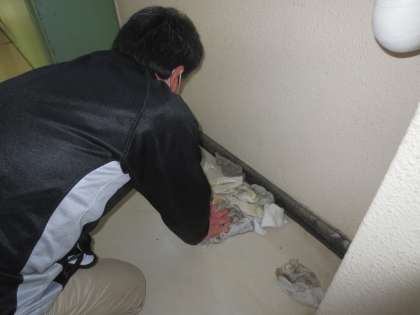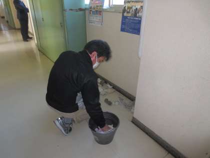 ときわ学級の皆さん、お元気ですか。昨日は冷たい雨でしたが、今日はよく晴れましたね。今日は朝から、ときわ学級の第1教室前が大変なことになっていました。昨日の雨がしみ込んで、雨漏りが起きていました。通常学級の先生が気づいて、雑巾できれいにふいてくださいました。ありがたいことですね。