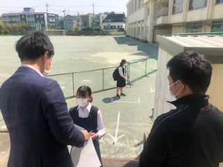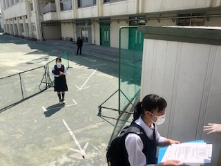 教科書を一人一人に手渡しますが、その待つ間も一定間隔を空けて待っています。