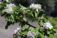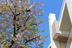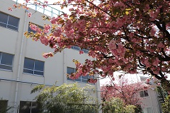 松沢中学校には、桜が無いと思っていませんか?実は様々な場所に桜の木があります。1枚目は随分と散ってしまいましたが、大きな染井吉野です。今は使われていませんが、昔の通用門の横にあります。2枚目は八重桜です。ピンクが強く、今が丁度満開です。きれいですね。3枚目は、まだまだ小さなひめりんごです。これからの松沢中学校を一緒に見守っていく一本です。白くてきれいですね。他にも、門の近くには枝垂桜や、校内には海棠(かいどう)という桜があります。どこにあるかは、来年の4月に探してみてください。