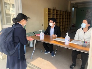 先生方が、一人一人の生徒の健康状態や学習の進み具合、休業中困ったことはないかなど確認をしていきます。生徒たちは、マスク越しに見る限りですが、ちょっと嬉しそうです。