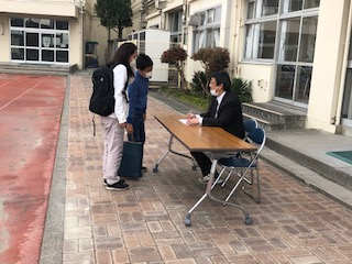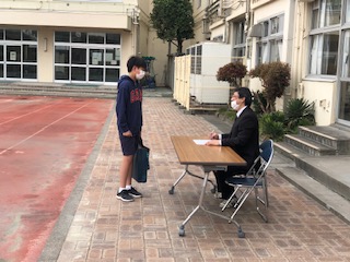 初めて会う中学校の先生と、健康状態や、家庭学習のことなど、話をします。生徒はちょっと緊張しながらも、しっかり受け答えしています。