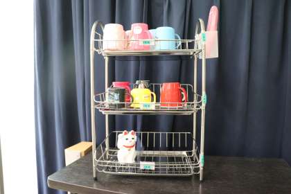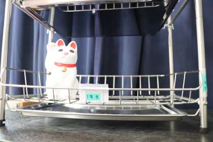 それと今年の4月から、コップ置き場を新しい物にしました。3段になっているので、学年ごとに分けて使えます。一番上が3年生、真ん中が2年生、下が1年生です。1年生のところには、まだコップが置いてありません。皆さんが入学してコップを置いてくれる日を、猫のマツコも待っていますよ。