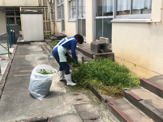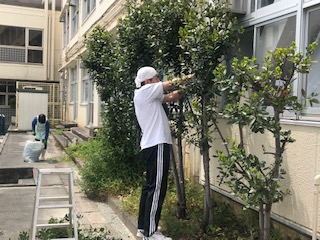 学校休業中でも、校舎内外のメンテナンスは必要です。今日は、職員の方々が、ときわ学級の前の背の高い木々の剪定と、周辺の雑草取りをしてくれました。「植物の生命力はすごいんですよ」と言いながら、草木と格闘(?)してくれたおかげで、とてもきれいになりました。