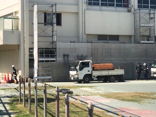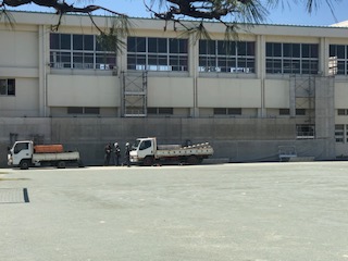 体育館周りにトラック、そして足場が組まれています。これはなんのためかと言うとーそうです。体育館の空調設備の工事がいよいよ始まりました。学校休業中の5月いっぱいで工事が終わるとよいのですが、予定では少し6月に食い込んでしまうかもしれないということでした。楽しみですね。