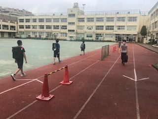 今日は1年生の分散登校日です。朝、小雨が降り心配しましたが、配布開始の時間には雨も上がり、生徒たちも順路に沿って動いています。