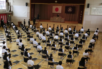 朝からの雨がちょうど小降りになった昼過ぎ、3年生が登校してきました。時間に余裕をもって学校に来た生徒が多く、玄関でクラス分けの学年通信をもらうためにソーシャルディスタンスを守り並びます。