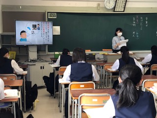 国語の授業では「言葉の共有」という単元を学習していました。「言葉の獲得の過程がもたらすものについて考える」「構成の文章展開の効果を理解する」という本時の目標達成に向けて、生徒たちは真剣に取り組んでいました。