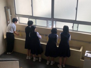 今日から、簡易献立ながら給食がスタートしました。まずは手洗い。順番を守りながら、入念に手洗いを行います。