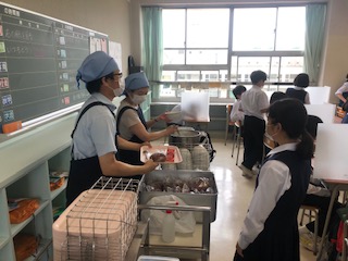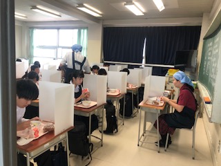 今週は、担任や副担任の先生方を始め、学校の教職員総出で給食を配膳します。教職員はみんなお揃いの紺のエプロンと水色の三角巾を着用しています。手際よく生徒たちの給食の配膳を行えたので、生徒たちは久しぶりの給食をゆっくり食べることができました。今、給食はみんな前を向いて食べていますが、一日も早く、ワイワイおしゃべりしながら楽しく給食を食べることができるようになるといいですね!