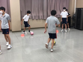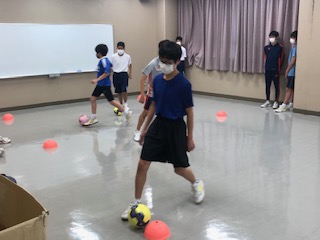 今日はあいにくの雨模様なので、サッカー部は、室内でボールタッチのトレーニングです。