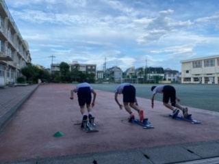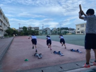 校庭では陸上部が活動をしました。短距離は、スターティングブロックを使っての50メートル、長距離は、500メートルをそれぞれ数本走りました。