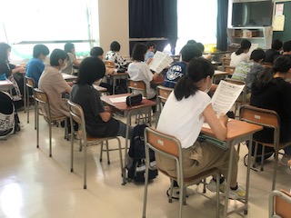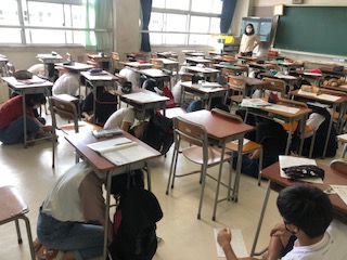 避難訓練は月に一度実施されます。「もしも」の非常事態に冷静に対応するには、日頃の訓練が大切です。今日は地震が起きたことを想定して、机の下に身を隠すこと、いざという時に備えるための基本的な「命の守り方」について放送とプリントを使って確認を行いました。