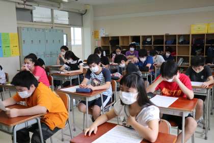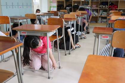 地震の放送を合図に、全員頭を守るように、机の下に素早く入り、避難することができました。その後は、放送による災害時の心得を聞き、火災や地震、不審者が学校に来た場合、どのように行動したら良いかの確認をしました。皆、静かに話を聞くことができました。