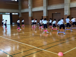 ときわ学級の保健体育の授業では「ハードル」を行っていました。ストレッチや、足ゴムベルトを付けての足の開閉運動で股関節まわりを入念に動かした後、いよいよハードルに挑戦です。