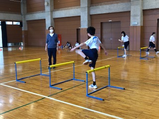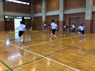 最初はアプローチの練習。歩いてハードルを超えて足の抜き方を確認します。その後ハードルを2台並べ、インターバルを意識して連続して跳ぶ練習を繰り返し行なっていました。生徒たちは頑張って練習していました!
