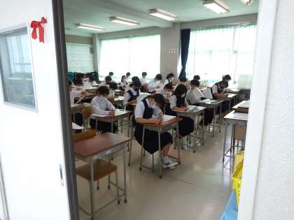 1年生にとっては中学校に入学して初めての定期考査となります。予鈴が鳴り、問題用紙が配られはじめた時から緊張の面持ちです。さあ、本鈴が鳴りました。それと同時に答案用紙をめくりテスト問題に取り組みます。この緊張感が立派です!