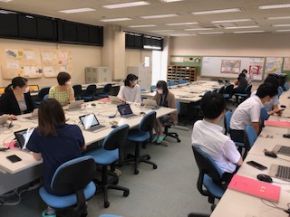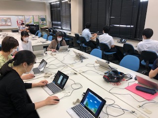 テストで生徒が下校した午後、研修担当の先生方でズームを使った双方向のやりとりについて研修を行いました。タブレットを見ながら、操作の仕方についていろいろな情報を共有しました。