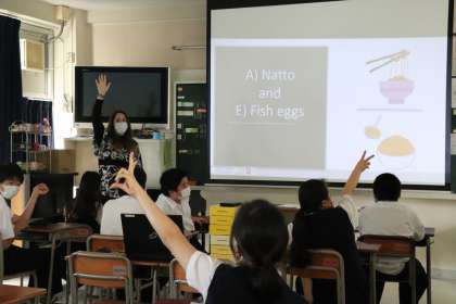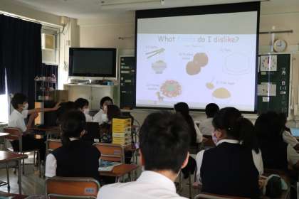 まずはプロジェクターを使ってALTの先生の自己紹介です。先生の好きなもの、嫌いなものが、イラストつきでクイズで紹介されました。英語を活用しながら楽しく会話ができました。