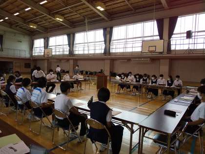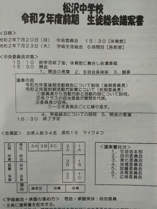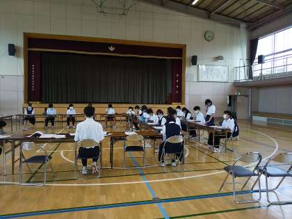 今週木曜23日の6校時に平成2年度の生徒総会が予定されています。本来ならば全校生徒が体育館に集まっての総会になりますが、今年度は感染症対策のため生徒が一堂に会することができません。そのため本日放課後に生徒会役員、各種委員会の委員長、そして各クラスの代表として自治委員が参加し、体育館で中央委員会を行いました。