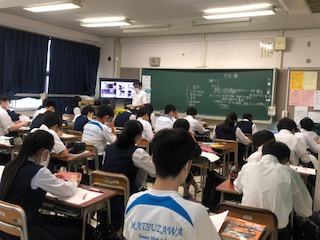 3年生の社会(公民)では、自由権について、新聞記事やコマーシャルの映像を活用しながら授業を進めていました。生徒たちは、興味深そうに画像を見ながら先生の話を聞いてました。