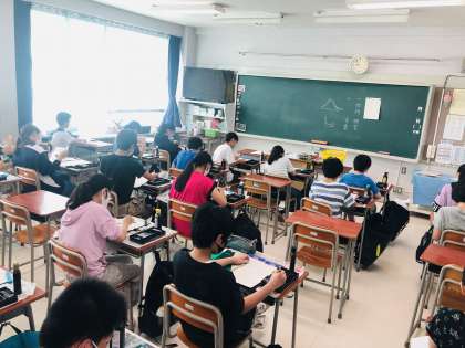 月曜日から始まった学習支援日には、1時間目から多くの生徒が各教科の学習に取り組んでいます。あるクラスでは、今日は書道です。久々に持つ筆に少し緊張しながらも頑張っています。