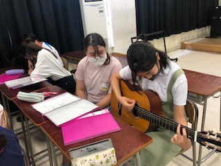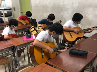 1年音楽の授業では、ギターの実技テストの練習をしています。今日の授業は、夏休みの補充授業とは思えないくらい多くの生徒が参加していました。中にはギターを弾きながら『カントリーロード』をハミングする人もいました。生徒たちは、リラックスした雰囲気の中で楽しそうにギターを奏でていました。みんな上達したかな?