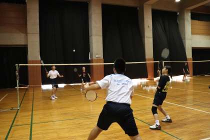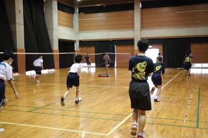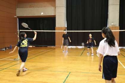 バドミントン部では、基礎的な準備運動をしてから、ペアを組んで練習を行いました。
