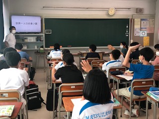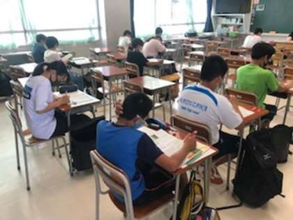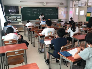 英語の補習授業では、be動詞の復習を行っていました。社会では、1学期の地理の復習を行っていました。世界各国の地理に関わる問題について、クイズ形式で答えを考えていきます。生徒たちは楽しみながら学習を進めていました。国語は「夏休みの宿題を進める」ということで、生徒たちは黙々と自分の課題に取り組んでいました。
