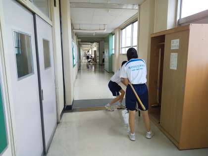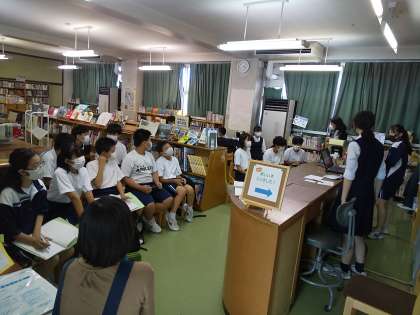 画像は、話し合いの後に清掃用具の点検をしている美化委員と、図書室で話し合いをしている図書委員会の様子です。