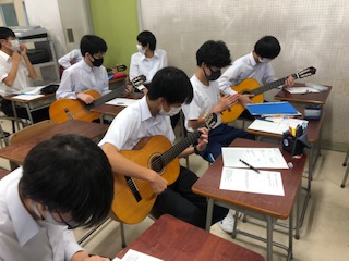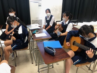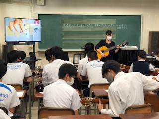 3年生の音楽では、ギター演奏を行なっています。最初にコードの押さえ方やストローク双方のポイントを確認した後、課題曲「カントリーロード」を弾いてみます。