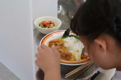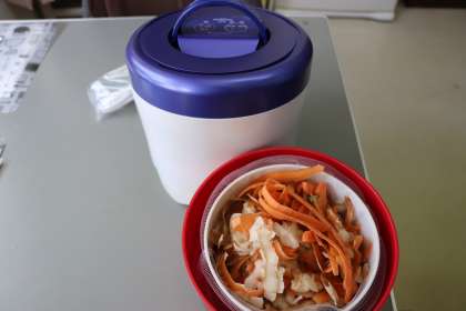 今年度から、調理で出た生ごみを、機械で乾燥させて畑に活用することになりました。乾燥したごみは、土に埋めると堆肥になります。堆肥を使って、美味しい野菜が育つといいですね。