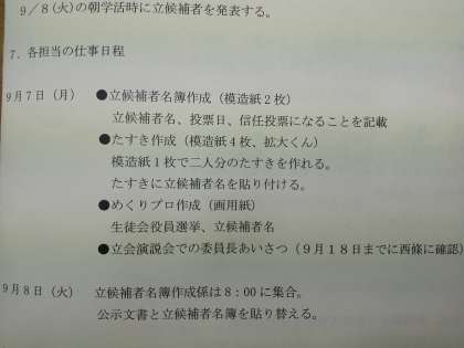 昨日の放課後、第2回めの選挙管理委員会が開かれました。前回の公示に対し、立候補者並びに応援演説者が決まり、今回はその人たちの紹介がありました。