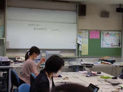 担任の先生たちはそれぞれの教室で、そして副担任の先生はパソコン室に集まり、実際にビデオ会議に挑戦してみました。校長先生は校長室から会議に参加しています。