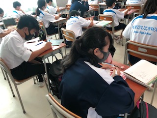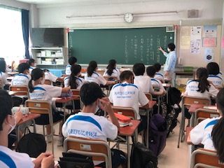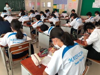今日の?1年生の国語の授業は文法を学習しています。主語、述語、修飾語、接続語、独立語など文の成分について、今まで学習した復習を進めます。さらに自立語、付属語、自立語のひとつである『名詞』について詳しく学びました。生徒たちは、先生の話をしっかり聞いていました。先生は、授業の最後に「文法は決して難しいものではなく、日常生活の中で自然に使っているものです」と言っていました。「文法は難しい!」という苦手意識なく学習に取り組めるといいですね!