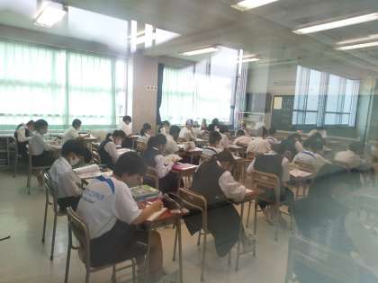 今日から今年度第2回目の定期考査が始まりました。画像は1時間目の自習の様子です。本校では、考査期間の一時間目は毎回自習の時間に充てています。これは、この時間を利用して少しでも生徒のみんなに学習のまとめをしてもらいたいというねらいです。どの学年の生徒も一言も話さずに真剣に学習に取り組んでいます。この定期考査に向ける意欲がよく伝わります。みんな、がんばれー!心から応援していますよ。