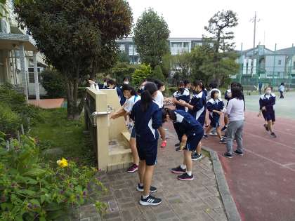 三密を回避しての手洗い 公開日 2020/10/05 更新日 2020/10/05 できごと 全体練習終了後は、三密を回避して各学年・男女別に時間差をつけて手洗いをします。これからも感染症の予防のため考えられる対策は確実に行ってまいります。