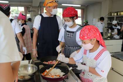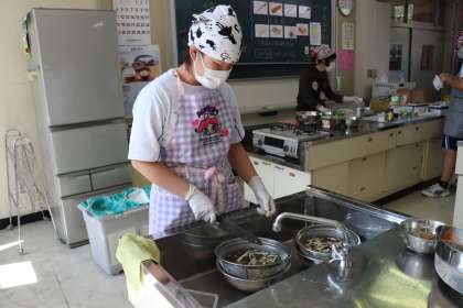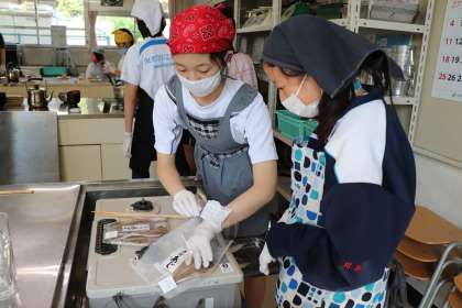 ときわ学級調理の様子 公開日 2020/10/05 更新日 2020/10/05 ときわ学級 ときわ学級の良い所は、先輩が後輩に作業を教えることが多い所です。 2年生が1年生に、魚の並べ方を教える場面がありました。