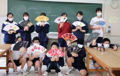 紙にデザインを描いた後、そのデザインをカーボン紙で扇子に転写し、アクリル絵の具で仕上げました。