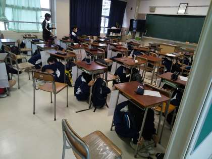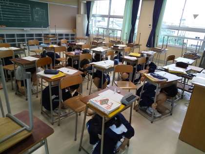 今日の6時間目には地震を想定した訓練を行いました。今回の訓練は生徒には知らせず抜き打ちの訓練でしたが、教室に放送が入ると生徒は静かに聞き入り整然と指示に従い机の下に避難しました。同時に担当の先生はすぐに外に出られるようドアや窓を開けるなどの対応をします。
