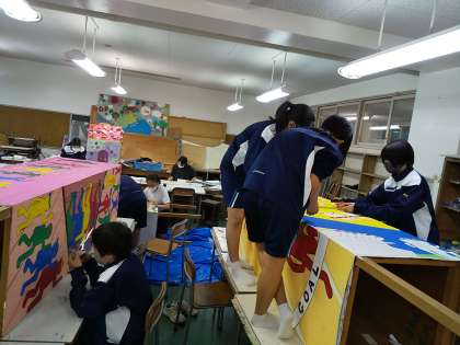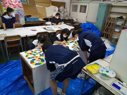 美術室では運動会で使う入退場門を作製中です。毎年、美術部の生徒の力作が運動会で披露されます。今年もみんなで力を合わせて、素晴らしい入退場門ができそうです。