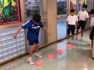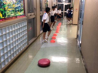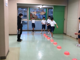 雨で校庭は使えませんが、室内で工夫しながら練習を行なっています。