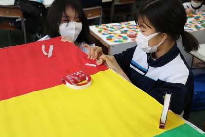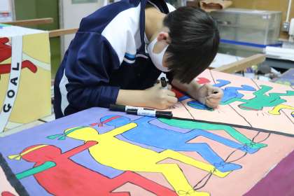 部員全員でテーマを決め、3年生が図案を描き、2年生が中心となって制作しました。