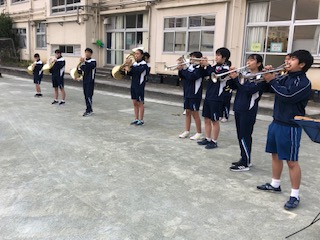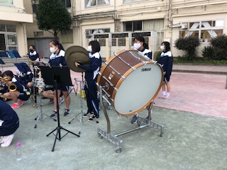 運動会では、吹奏楽部が運動会開始のファンファーレと入場行進の音楽を担当します。少しずつ暗くなりかけている校庭で、最後の仕上げ練習をしています。ファンファーレを奏でるトランペットをはじめとする金管楽器と、打楽器の音が力強く響きます。