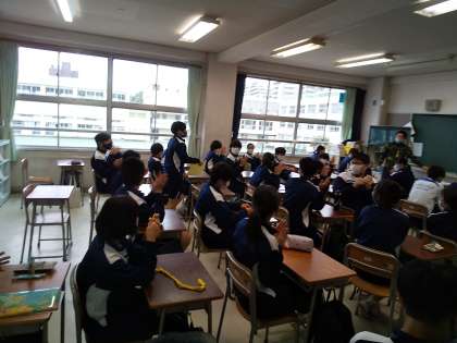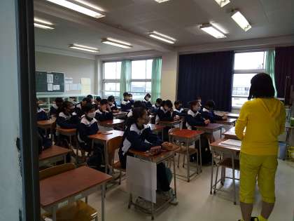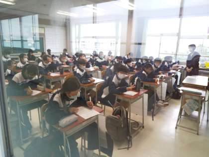 閉会式での結果発表も終わり、賞状をもらった生徒がクラスに戻ってくるとクラス全員が拍手で迎えます。その後の、校長先生の講話もみんなしっかりと聞いています。閉会式後、一年生の教室では運動会の反省に取り組んでいました。