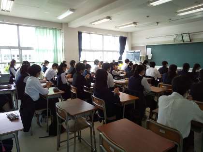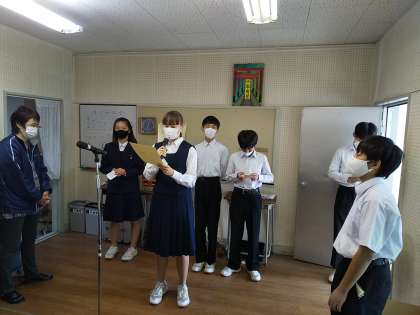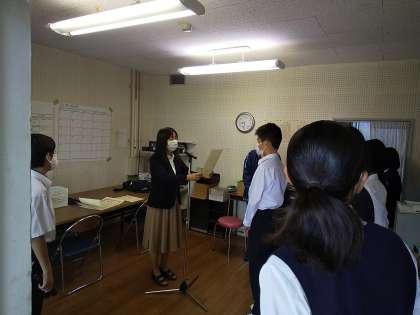 全校生徒が一堂に集まることを避け、今日の生徒朝会も放送で行われました。後期最初の生徒朝会は、先日の選挙で選ばれた生徒会役員並びに各種委員会で決まった委員長の任命式です。校長先生から一人一人に任命証が手渡されました。その後、役員と委員長が自己紹介と今後との抱負を全校生徒に話しました。教室では、そのあいさつに大きな拍手で応援の気持ちを表していました。