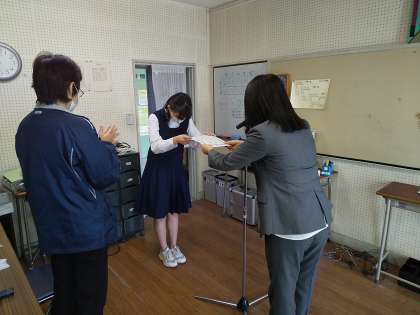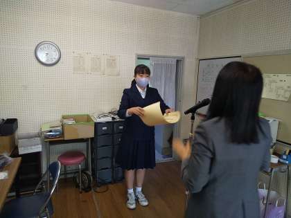 生徒会朝会の後に引き続き今月も表彰が行われました。本来なら全校生徒の前で表彰をしたいところですが、現在の感染の広まりを考えるとやむをえません。先ほどの委員長の話のときも一人が話し終わると、そのたびに担当の先生がマイクを消毒をするなど本校でも引き続き感染症への対策はしっかりと行っていきます。